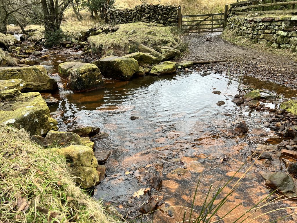 Keep following the trail downhill until you reach a gate. At the other side of the gate is a narrow beck that is not very deep. On the right are some stepping stones you can use, but sometimes they are typically not needed.